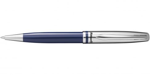 Metal ballpoint pen with rotary mechanism; glossy lacquered lower part; Top, clip and tip chrome-plated; Robust clip due to spring-loaded mounting; Equipped with interchangeable large-capacity refill; Blue paste, indelible according to ISO 12757-2