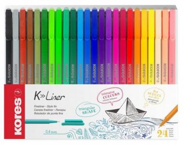 Kores K-Liner არის 24 ფერის ნაკრები - მეტალის 0.4მმ წვერით. კალმები წარმოდგენილია სამკუთხა, ერგონომიული კორპუსით, რაც ხელს უწყობს კომფორტულ მოჭერას და აქვთ ვენტილაციური თავსახური. ეს ნაკრები იდეალურია წერისთვის, ხატვისთვის, დოკუმენტების შედგენისთვის, ასევე სამუშაოსთვის სახაზავით ან შაბლონით მუშაობისას.