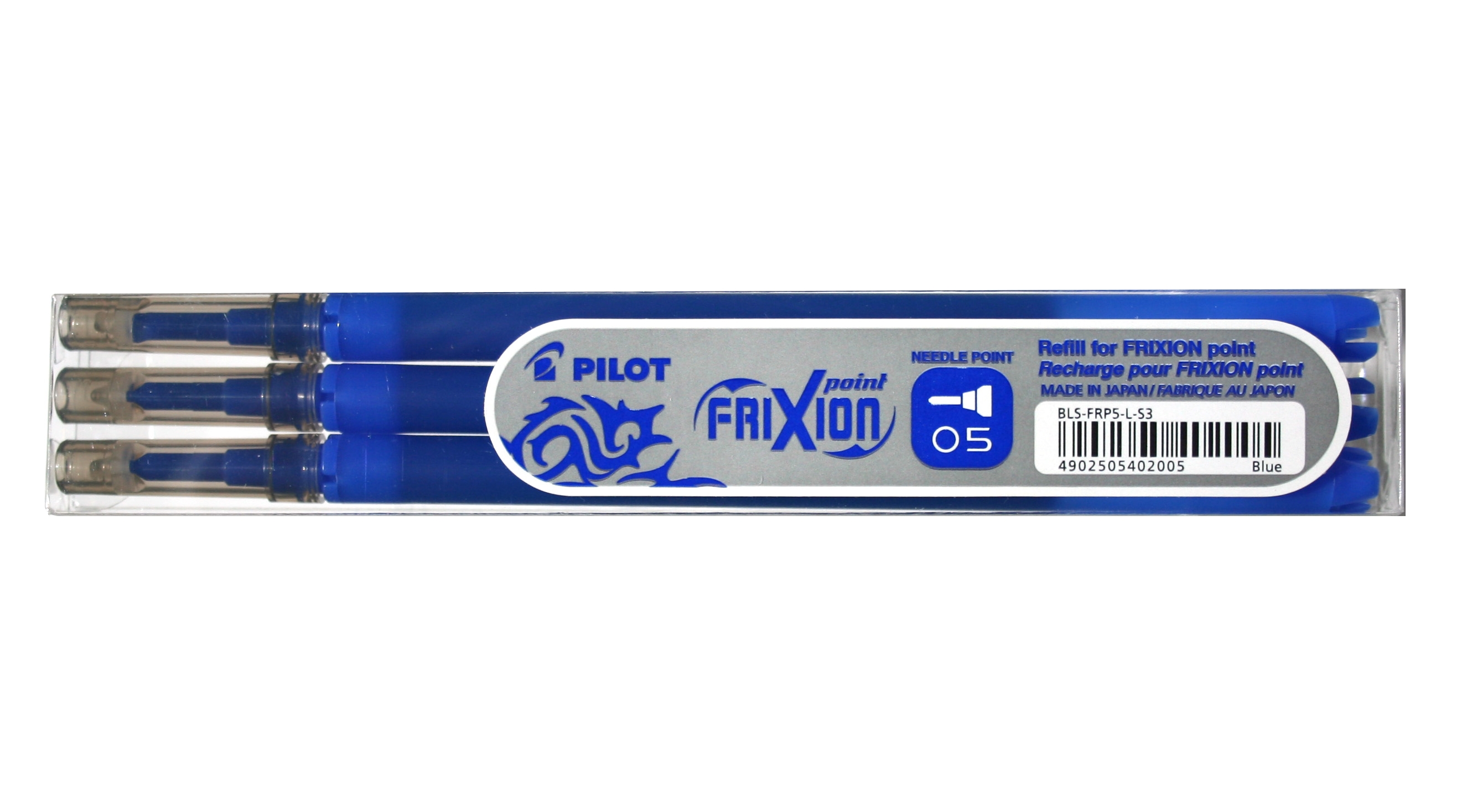 სამი ცალი 0.5 მმ-ის ლურჯი კარტრიჯი, რომელიც თავსებადია Pilot FriXion Ball Knock გელ-კალმებთან და სტანდარტულ Pilot FriXion 0.5მმ წვერის წაშლად გელ-კალმებთან.