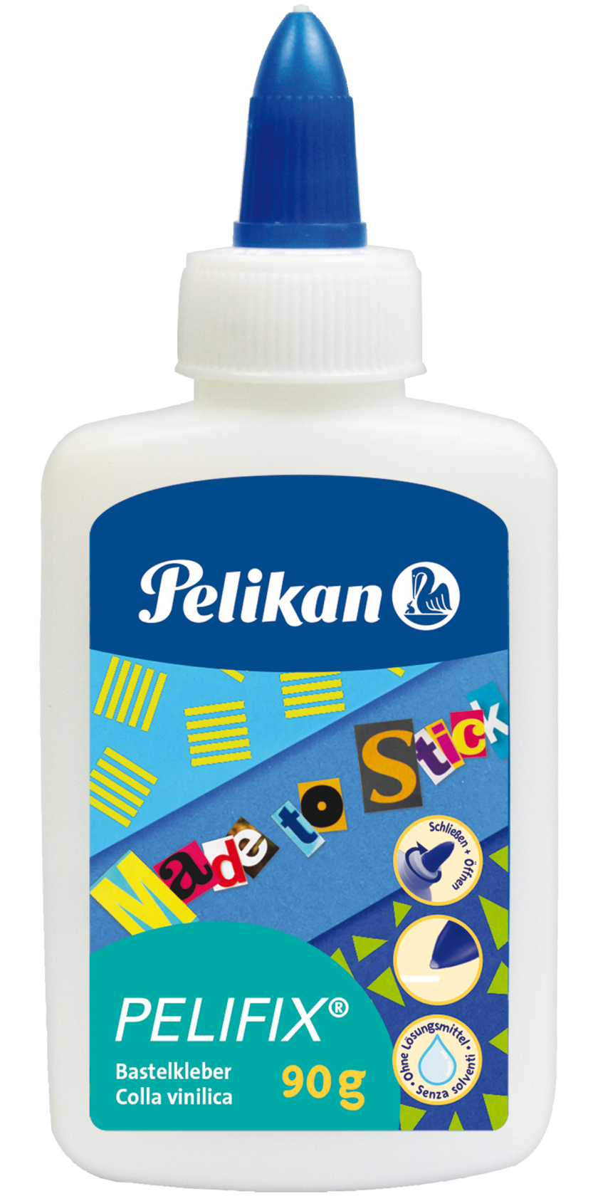 Craft glue for quick and clean gluing; Glues paper, cardboard, photos and much more; Transparent drying; Solvent-free; Warm washable; In a handy bottle with a thin tip; Content: 90 g