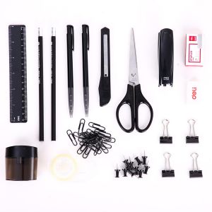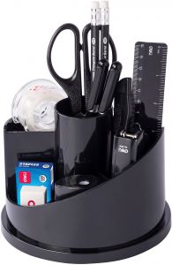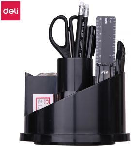 სანაცელარიო ნივთების კრებული (ორგანაიზერი) - სპირალური ფორმის მბრუნავი კორპუსით, 7 სათავსო ჯიბით, კორპუსის შუაში ცილინდრული ფორმის სათავსოთი, ძირის დიამეტრი 150მმ, მბრუნავი ძირის დიამეტრი 110მმ, სიმაღლე 115მმ, შავი ფერის პრიალა ზედაპირით, 17 ნივთიანი: სკოჩის დისპენსერი, სახაზავი 15სმ, ფანქარი საშლელით HB ერგონომიული სამკუთხა კორპუსით, ჭიკარტი ლურსმანი(10 ცალი), სტეპლერი #10, კლიპსი 19მმ(4ცალი), კალამი ღილაკით 0.7მმ წვერით-2ცალი, საკანცელარიო დანა პატარა, სტეპლერის ტყვია #10, სკრეპი #3(20 ცალი), სათლელი კონტეინერით, მაკრატელი 17სმ, საშლელი, სკოჩი -18მმ სიგანის.