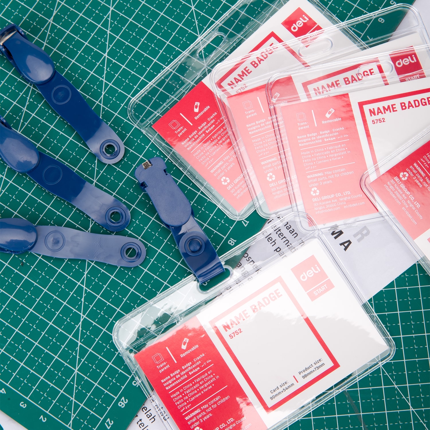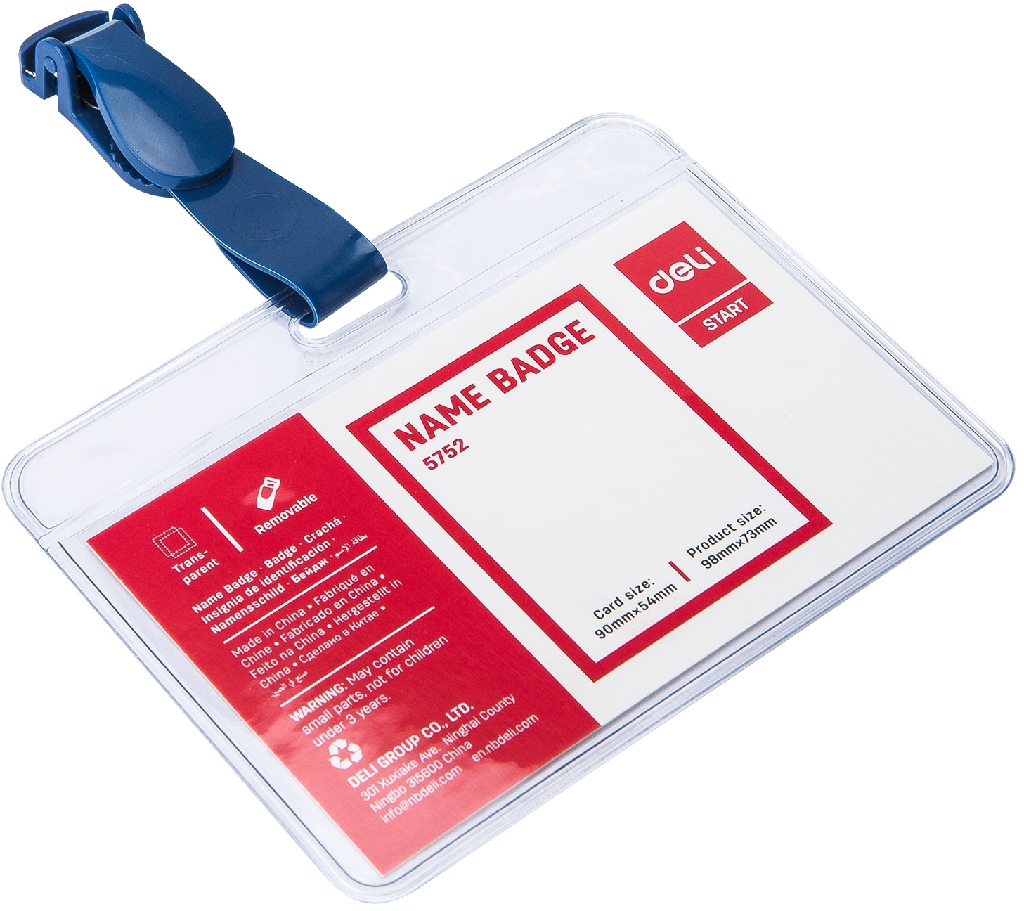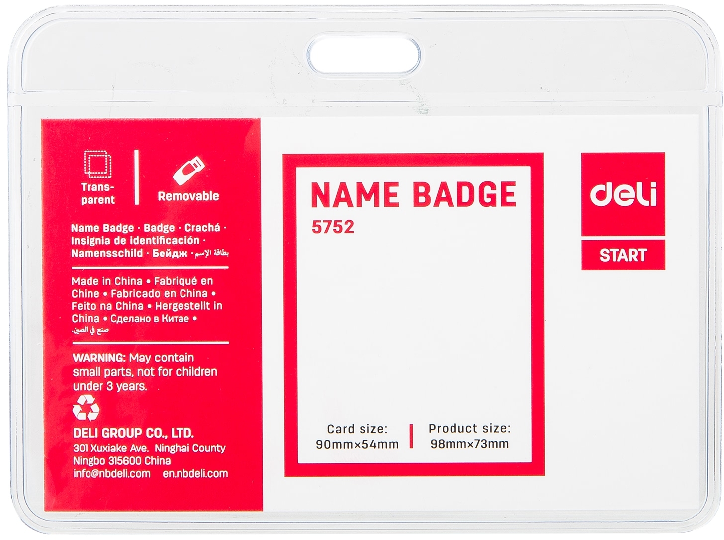 სამკერდე ბეიჯი სამაგრით, პლასტიკური, გამჭვირვალე ფაქტურის Deli 90x54მმ