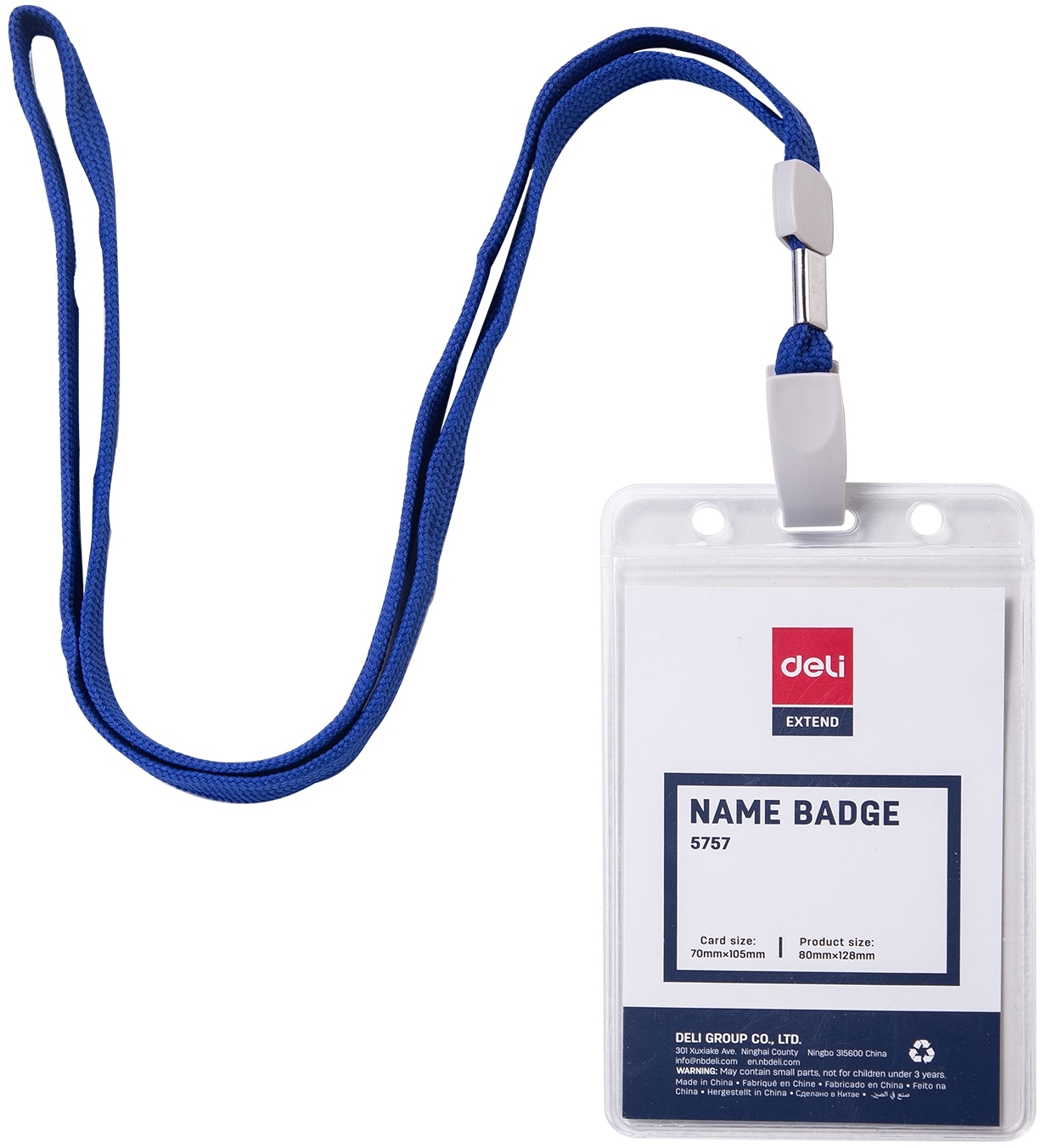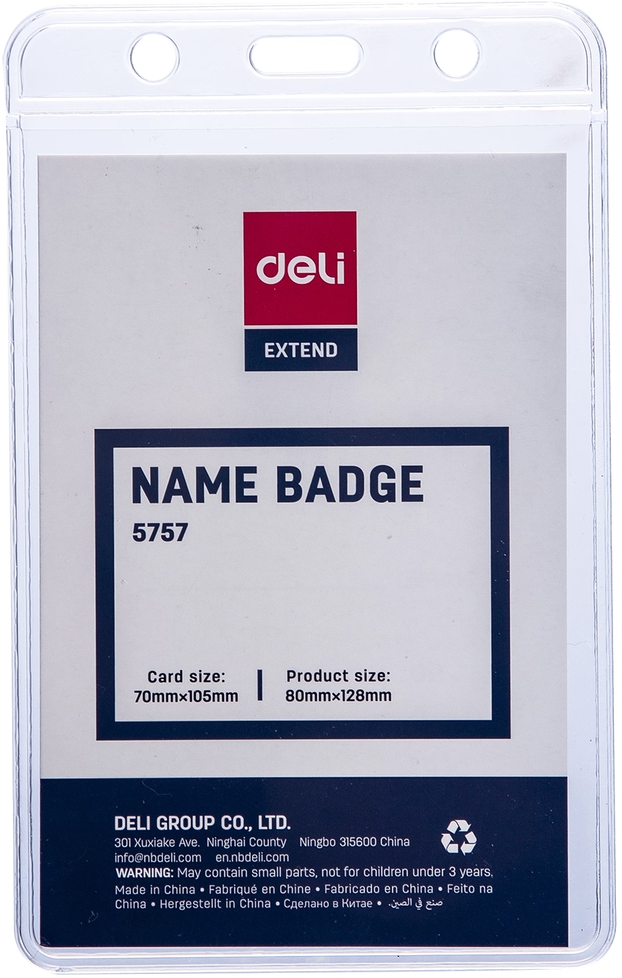 ვერტიკალური ბეიჯი ზონრით პლასტიკური გამჭვირვალე ფაქტურის Deli 105x70მმ