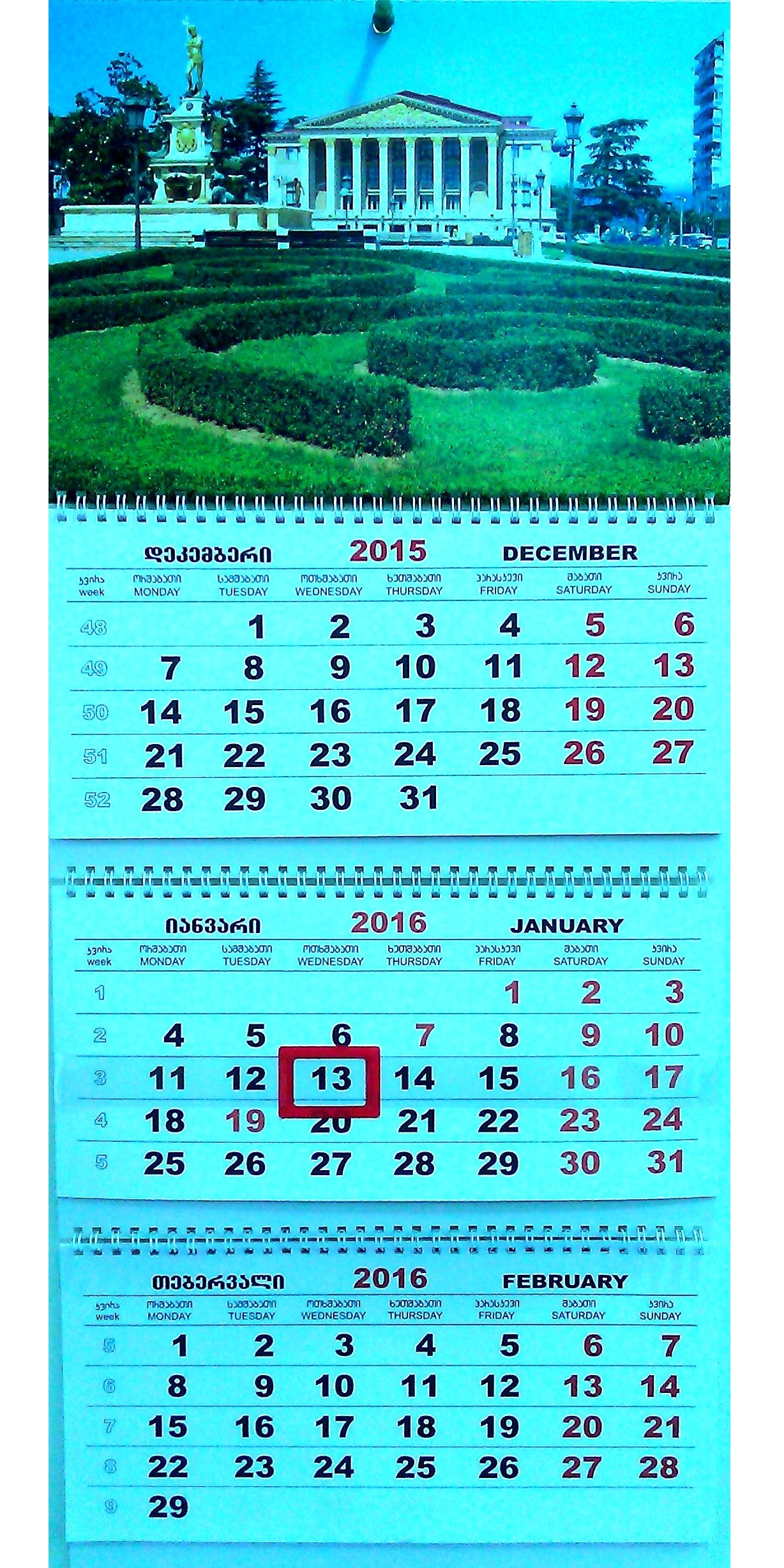 კედლის სამგანყოფილებიანი კალენდარი 2026, სხვადასხვა ხედით
