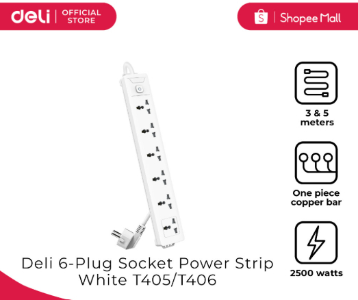 დამაგრძელებელი, 6 უნივერსალური და 3 USB პორტით Deli 2მ