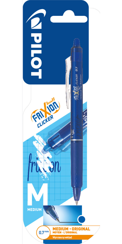 საშლელიანი კალამი FriXion Clicker ბლისტერის შეფუთვაში ლურჯი Pilot 0.7მმ წვერით