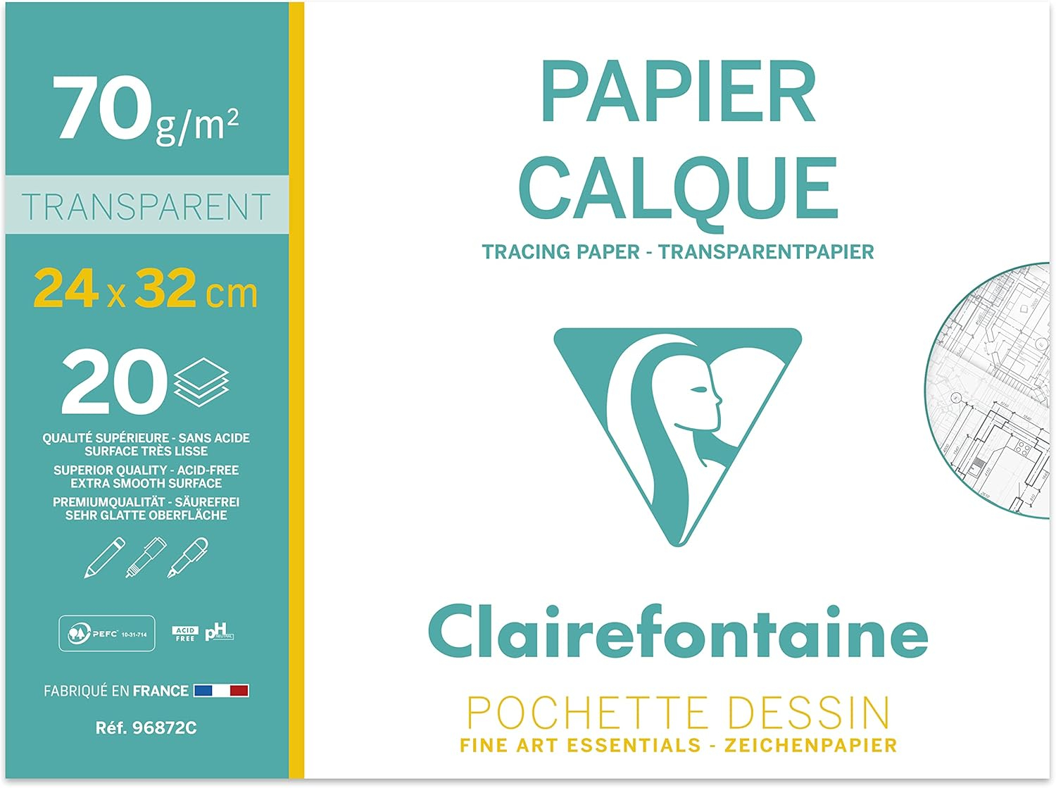 მაღალი ხარისხის კალკის ქაღალდი Clairefontaine 24x32სმ 75გ/მ² 20 ფურცელი