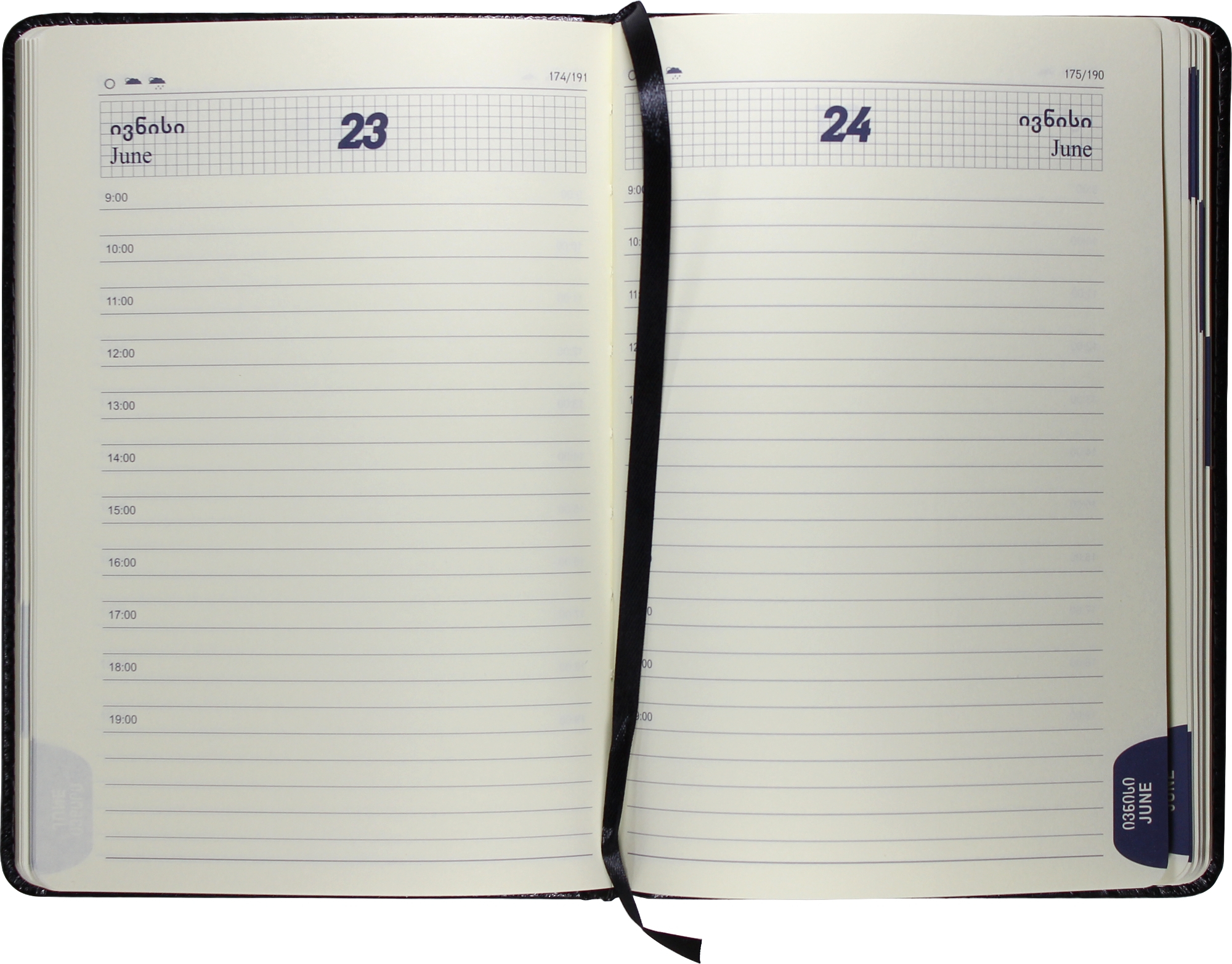 ყოველდღიური ბლოკნოტი A5; 2026 წლის, ლურჯი იისსფერი ტყავის ყდით, ქართულ-ინგლისური Helio